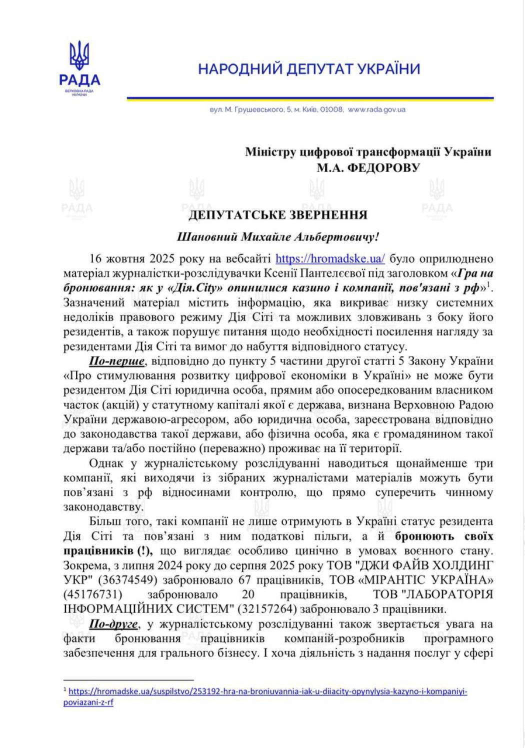 Народний депутат Данило Гетьманцев звернувся до Міністра цифрової трансформації Михайла Федорова після розслідування «Громадського» під назвою «Гра на бронювання: як у “Дія.City” опинилися казино і компанії, пов’язані з рф». У листі Гетьманцев підтвердив висновки журналістів і зажадав термінових перевірок усіх резидентів режиму.
