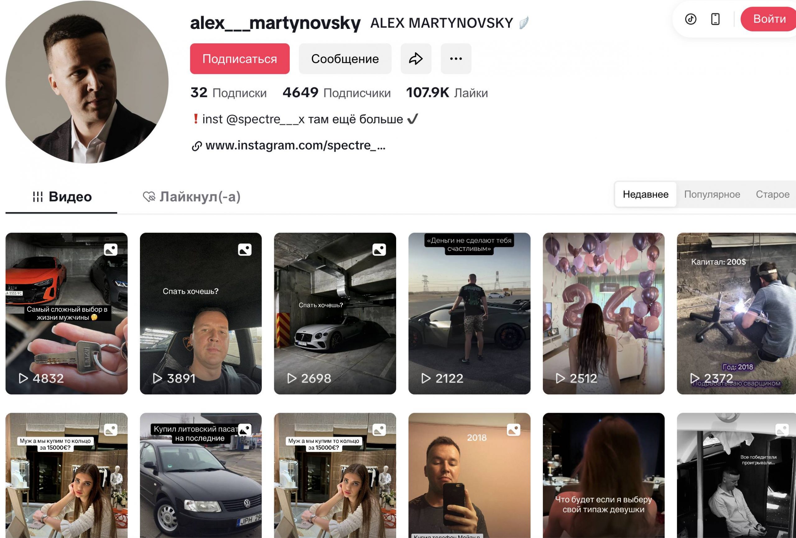 Мартиновський уникає конкретики про себе. Каже, що продав телеграм-канал за мільйон доларів, працював у Польщі, отримав магістратуру з маркетингу, їздив на будівництві й у таксі. Сьогодні він — засновник платформи Tgtraffic, демонструє розкішне життя й залучає партнерів.